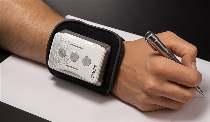NeMor® is a wrist-worn neurostimulation device for essential tremor. It delivers patterned, transcutaneous stimulation at the wrist, synchronized to the user’s tremor profile, and is designed to help reduce tremor amplitude during wear. The goal is steadier, more controlled hand movements for everyday tasks such as eating, writing, or using a phone—under clinician guidance.