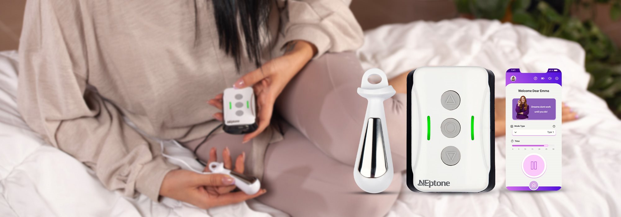 The stimulator features USB-C, Bluetooth® 5, and adjustable parameters, with 6 preset programs including pelvic-floor strengthening and PTNS. Dual channels support both surface electrodes and vaginal/rectal probes. The nePTONE® app lets users choose therapy type and follow a personalized program. Catalog-reported outcomes include: addressing stress/urge/mixed incontinence, managing chronic pelvic pain, instant menstrual pain relief, plus typical electrotherapy effects (e.g., local circulation); individual results vary. See User Manual for indications, precautions, and contraindications.